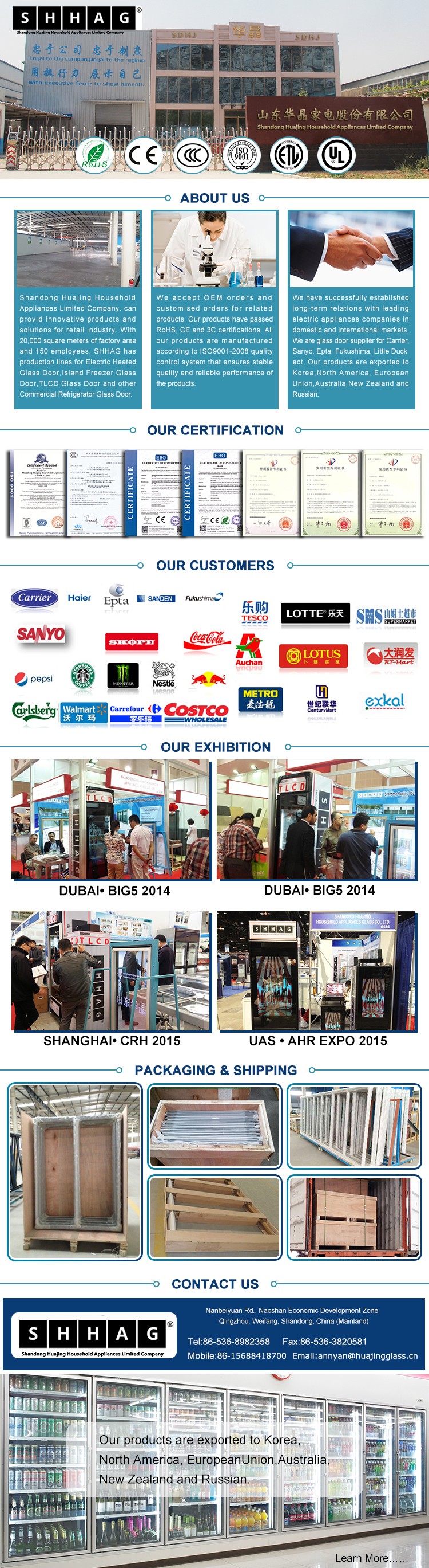 Shandong Huajing Glass Co., Ltd hält sich mit dem neuesten Trend auf dem Laufenden und hat Huajing Isolierglastüren mit beheiztem Glas für Supermarktdisplays zu einem wettbewerbsfähigen Produkt auf dem Markt gemacht. Es wird erwartet, dass es den Branchentrend anführt und den Kunden Vorteile bringt. Hergestellt nach dem strengen Managementsystem, hat unser Huajing Insulating Tempered Glass Door beheiztes Glas für Supermarkt-Vitrinen eine zuverlässige Qualität erlangt. Vor seiner Markteinführung hat es die Tests nach internationalen Vorschriften bestanden und ist von mehreren Behörden zertifiziert. SHHAG ist die Investition für Kunden wert, die nach Geschäftsmöglichkeiten suchen. Huajing Insulating Tempered Glass Door beheiztes Glas für Supermarkt-Vitrinen wird nicht nur hergestellt, um die Aufmerksamkeit der Menschen auf sich zu ziehen, sondern ihnen auch Komfort und Vorteile zu bieten. Von kreativen Designern entworfen, präsentiert Reach in Glastür / Gefrierschrank-Glastür / Kühler-Glastür / Kühlschrank-Glastür einen ästhetischen Stil. Darüber hinaus zeichnet es sich dank der verwendeten hochwertigen Rohstoffe und High-End-Technologien hervorragend aus.
