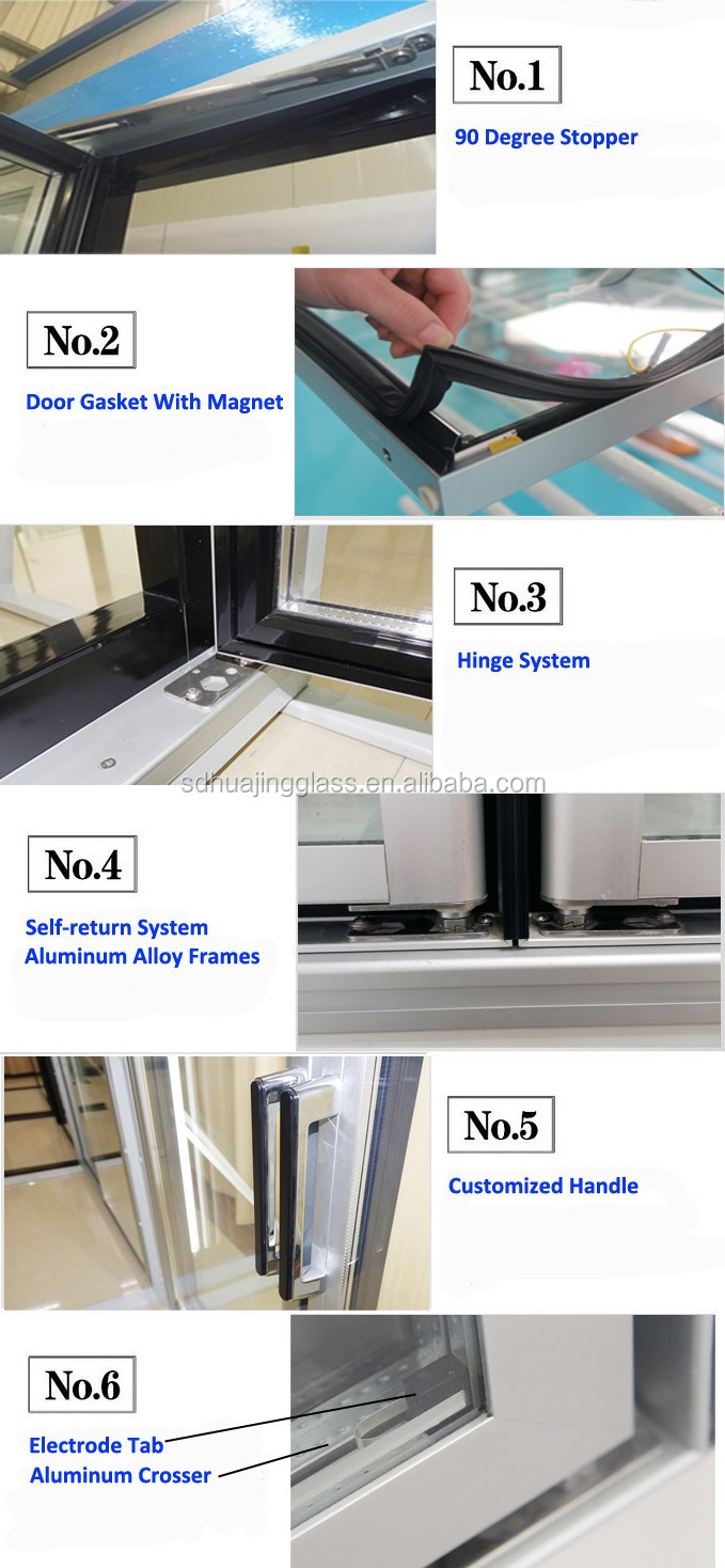 | Vorteile unserer Türen | 1. Anti-Fog, Anti-Kondensation, Anti-Frost 2. Thermische Isolierung, Konstante Kühltemperaturhaltung Produkte frisch. 3. Einfache Handhabung und Zugriff für Kunden und Mitarbeiter. 4,90° Offenhaltefunktion für einfaches Beladen. 5.Sicherheitsglastür. 6.used von Polysulfidkautschuk oder Silikonkautschuk versiegeln, Türdichtung mit magnt |