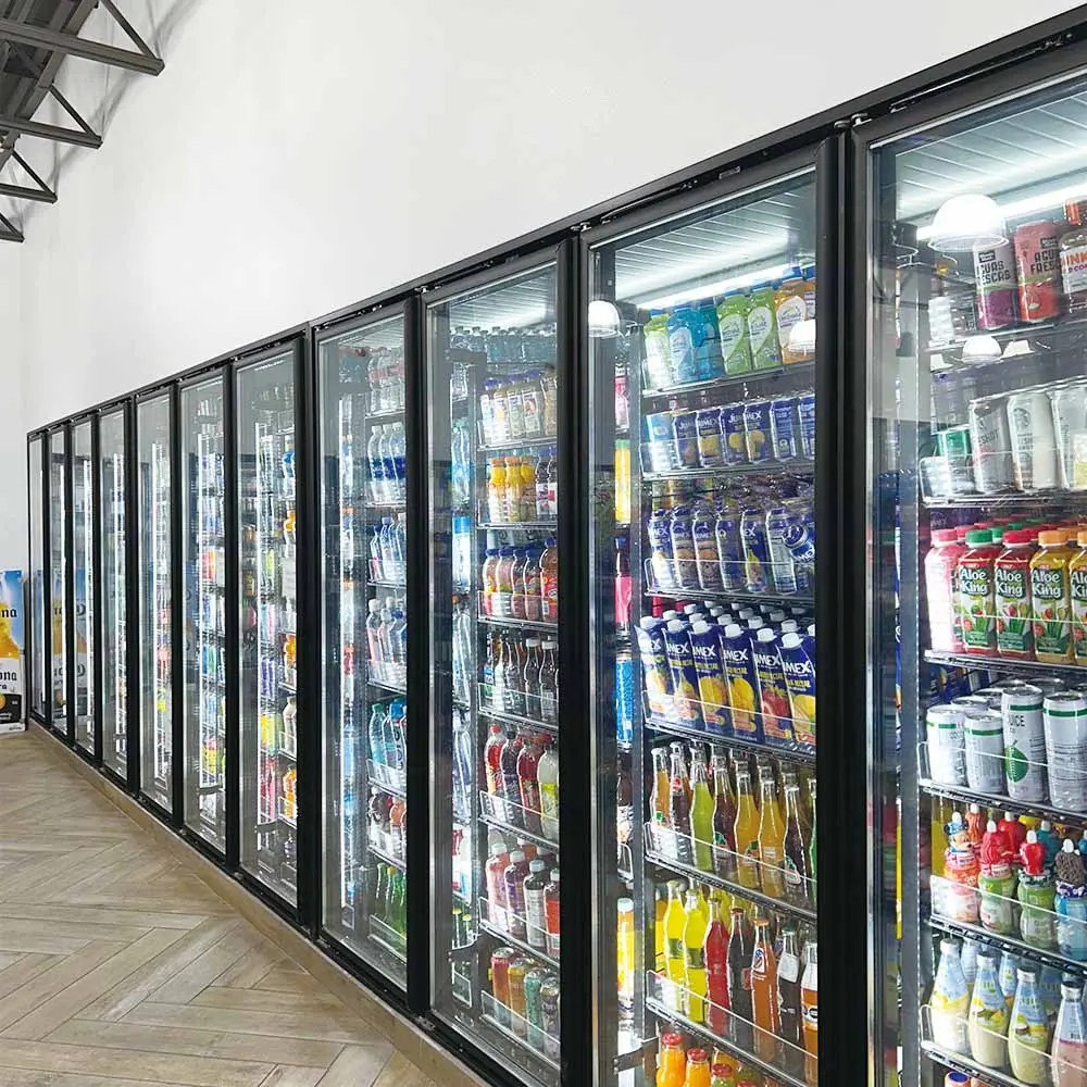 Refrigerators with heated glass doors for food display.