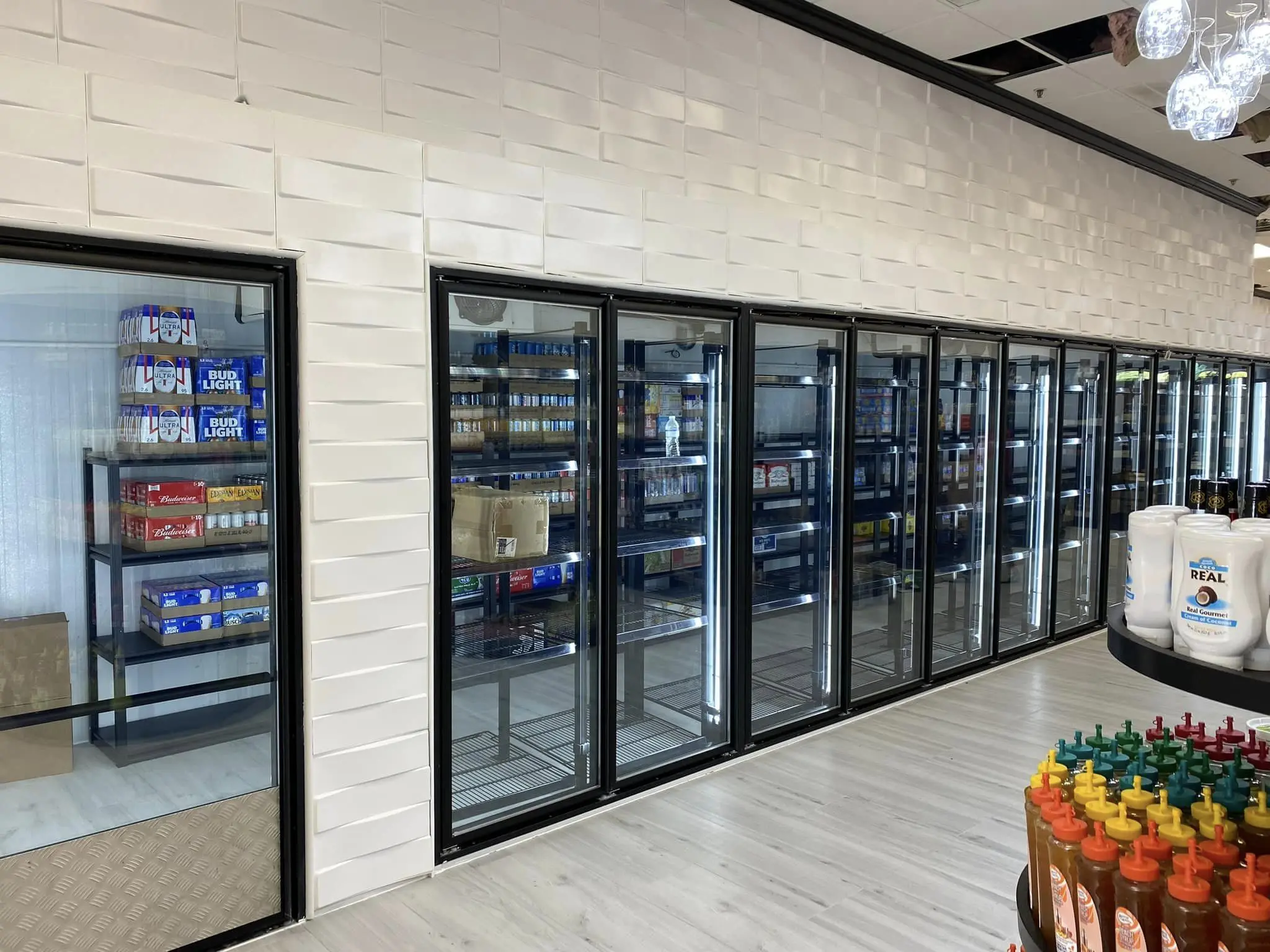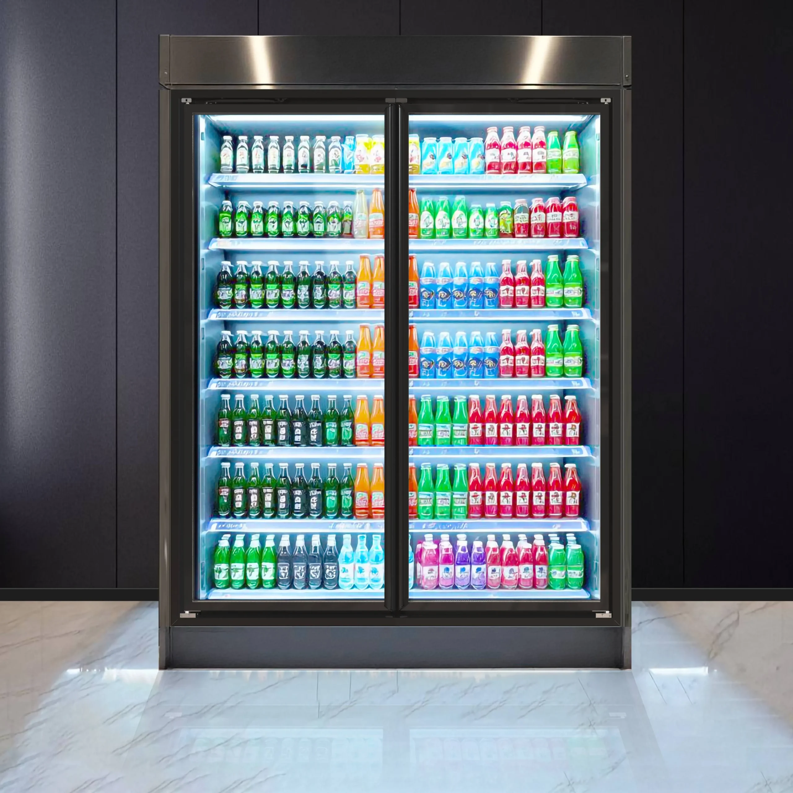 Refrigerators with heated glass doors for food display.